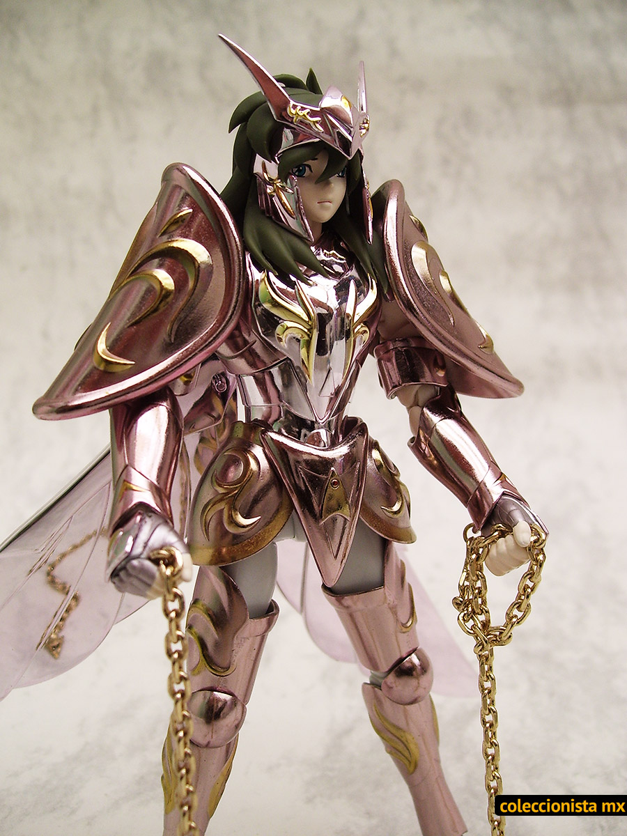 El color de la armadura con tonos brillantes es muy acertado, aunque no es fiel al visto en la serie, que tiene colores más vivos. Respecto a los materiales, Andrómeda Divino es casi todo de metal. Solamente las alas, casco, partes del peto y las piezas para sostener la falda son plásticas. Gracias a esto, visualmente luce uniforme. Las cadenas son metálicas, y como caso excepcional, son en color dorado en vez del acostumbrado plata.